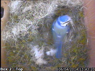 Nest building is well underway in Box 2 this year with a pair of Blue Tits who have taken up residence and very quickly building up a nest in the box. The male often stands on guard at the box, waiting for the female to return with more nesting material.